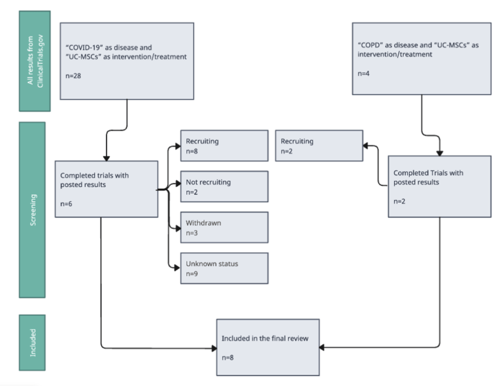 ClinicalTrails.gov was the database used to find clinical trials of UC-MSCS on either COPD and COVID-19. Inclusion criteria were defined to include peer-reviewed, human clinical trials published between January 2020 and December 2024. These studies were all investigating the use of UC-MSCs for treating inflammation in either of the diseases. Eligible studies included randomized controlled trials, non-randomized clinical trials, and pilot studies that reported outcomes focused on the safety, tolerability and efficacy of the treatment. Exclusion criteria includes uncompleted trials, in vitro studies, animal trials and studies that were not published in the English language. Only completed trials with posted results were included in the paper, with the exception of one singular study protocol in the COPD trials section. For Clinicaltrials.gov search, results from the search for “COVID-19” or “COPD” as the disease and “UC-MSCs” as the intervention/treatment were identified and considered for screening.