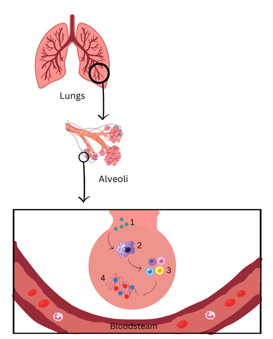Figure 2. Immune Cells in Cytokine Storms Figure 2 represents the role that immune cells play in cytokine storms that progress towards lung damage. As it enters, SARS-CoV-2 virus (1) infects the lungs cells. Immune cells (2), including macrophages, start to produce pro-inflammatory cytokines (3). The secretion of pro-inflammatory cytokines eventually causes a cytokine storm (4). Created on Canva.com