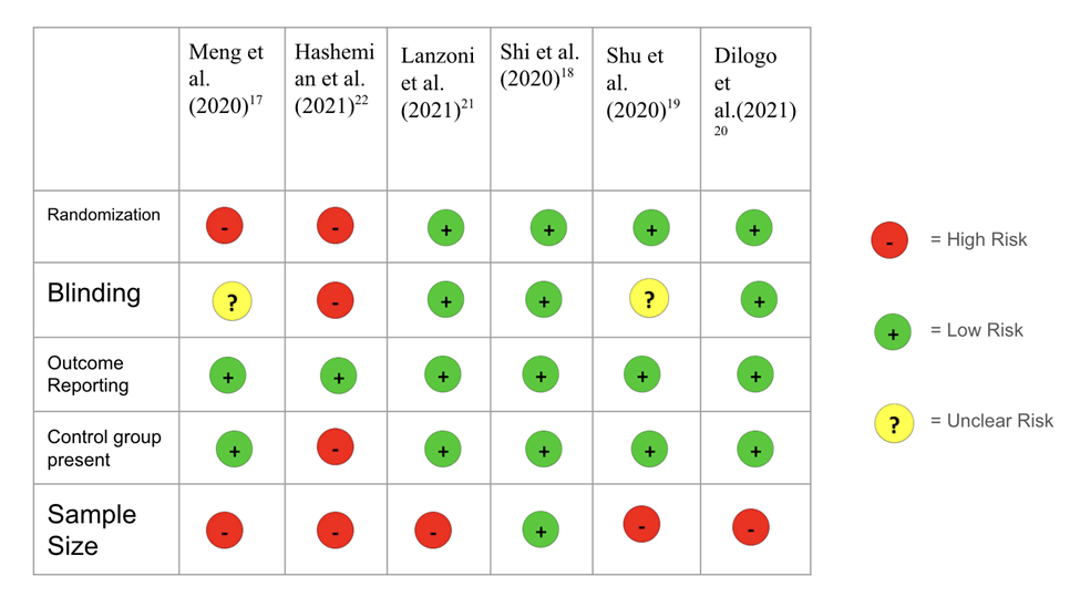 Risk of bias was evaluated for all of the trials based on key methodological criteria such as randomization, blinding, outcome reporting, sample size, the variability of doses and if there was a control group present. Among the six studies reviewed, four were randomized studies (Lanzoni et al. (2021)22, Shi et al. (2020)23, Shu et al. (2020)24, Dilogo et al. (2021)25). The other two were non-randomized studies (Meng et al. (2020)20, Hashemian et al. (2021)21). Randomized studies generally indicate lower risk of bias due to its stronger study design. However, two out of the six are not randomized and the sample was taken by availability, introducing potential selection bias. Blinding decreases the risk of bias. Meng et al. (2020)20, Hashemian et al. (2021)21, Shu et al. (2020)24 had either no blinding or blinding was not mentioned. On the other hand, Lanzoni et al. (2021)22, Shi et al. (2020)23 and Dilogo et al. (2021)25 were all double-blind procedures, meaning neither the patient nor the assessing physician were aware of the treatment assignment. All trials reported the outcomes that were investigated. Sample sizes also need to be taken into consideration. Not only is there a variety of sample sizes across the studies, but all of the trials except Shi et al. (2020)23 have a relatively small sample size. This can increase risk of random error and may not be generalizable. Dosage also varied widely among the studies. While it doesn’t directly impact bias, it raises concerns about the consistency in the results. It can act as a source of confounding and complicates comparison between studies. In other words, as the studies use different levels of doses, it is hard to tell whether differences in patient outcomes are due to the treatment itself or the amount of the treatment used which limits the ability to attribute observed effects solely to UC-MSC therapy. Additionally, Hashemian et al. further lacked a control group, which also limits the ability to attribute outcomes solely to the MSC treatment. Table 3. Risk of Bias on UC-MSC Clinical Trials for COVID-19. The risk of bias ranged from low to high across studies. Randomized trials with control groups and appropriate sample sizes were assessed as having lower risk, while early-phase, non-randomized studies without controls were judged to have higher bias risk. A complete risk of bias table is provided to detail these assessments for each individual study.