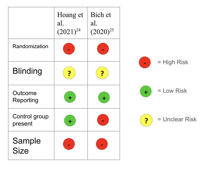 Risk of bias was evaluated for all of the trials based on key methodological criteria such as randomization, blinding, outcome reporting, sample size, the variability of doses and if there was a control group present. Among the two studies reviewed, both were non-randomized studies (Hoang et al. (2021)29, Bich et al. (2020)30), an indication of bias and a limitation in the COPD trials with UC-MSCs within this paper. Blinding was not mentioned for either of the trials. Both trials reported all outcomes that were meant to be examined.. Both of the studies have small sample sizes, increasing risk of random error and non-generalizability. Bich et al. (2020)30 did not have a control group, limiting the ability to attribute observed effects to the therapy. However, both studies in the COPD UC-MSC therapy studies have the same amount of dosage. This way, the amount of dosage cannot act as a confounding variable.
