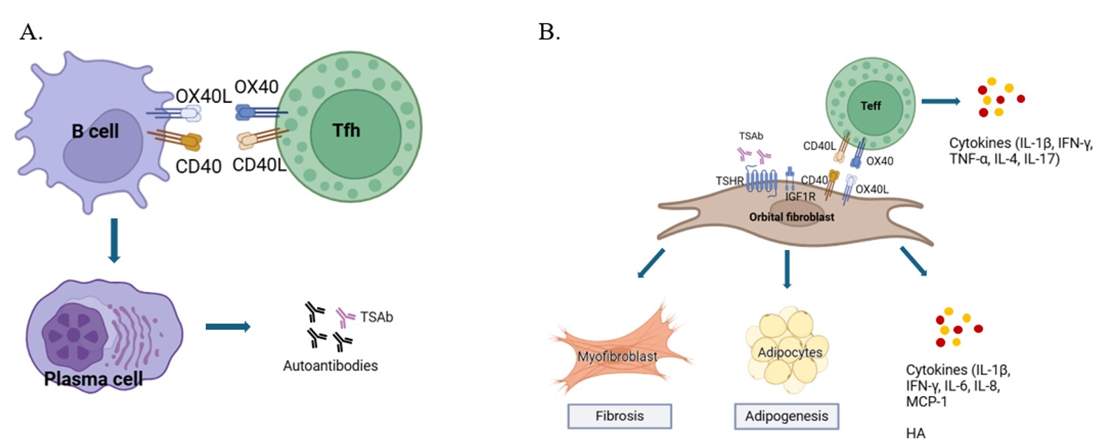 At its essence, TED involves immune dysregulation characterized by a breakdown of self-tolerance, triggering autoreactive T and B cells. These autoreactive immune cells, along with thyroid-stimulating autoantibodies (TSAbs) secreted by B cells, activate orbital fibroblasts. Once activated, fibroblasts recruit additional autoreactive T cells into the orbit. Reciprocal activation occurs between infiltrating T cells and orbital fibroblasts via MHC II and CD40/CD40L signaling pathways, fostering a proinflammatory and profibrogenic environment that promotes connective tissue remodeling13,14. Moreover, autoreactive T cells, upon recognizing antigen presented by B cells, amplify the B-cell response through costimulatory signals, generating pathogenic TSAbs that drive disease progression15.