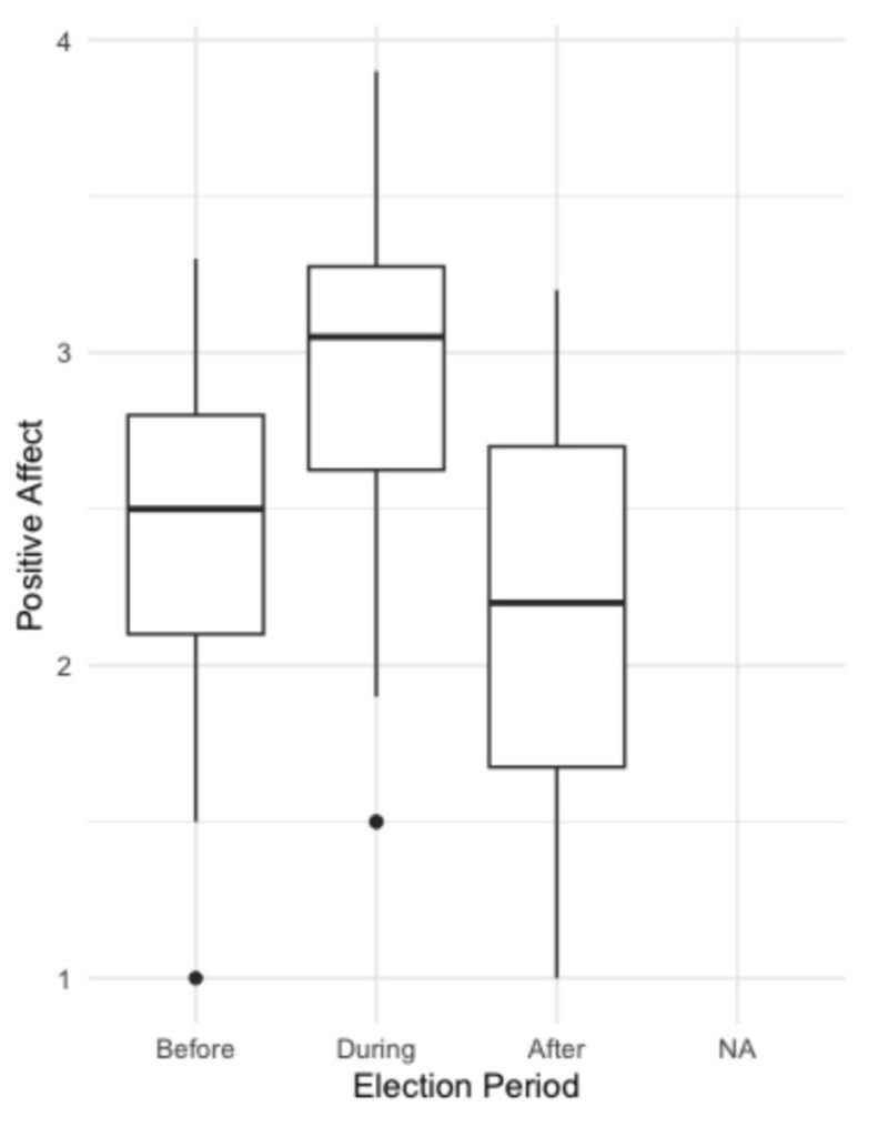 The initial regression model for positive affect yielded significant results (F(2, 58) = 4.76, p = .012), explaining 14.1% of the variance (R² = .141, adjusted R² = .111). During the election period, participants reported significantly higher levels of positive affect compared to the pre-election period (b = 0.41, SE = 0.18, 95% CI [0.05, 0.77], p = .026; β = 0.29, 95% CI [0.04, 0.54]), representing a moderate effect size (Cohen’s d = 0.60). As shown in Figure 1, although positive affect decreased in the post-election period compared to pre-election levels, this change was not statistically significant (b = -0.28, SE = 0.23, 95% CI [-0.74, 0.18], p = .236; β = -0.15, 95% CI [-0.40, 0.10]).