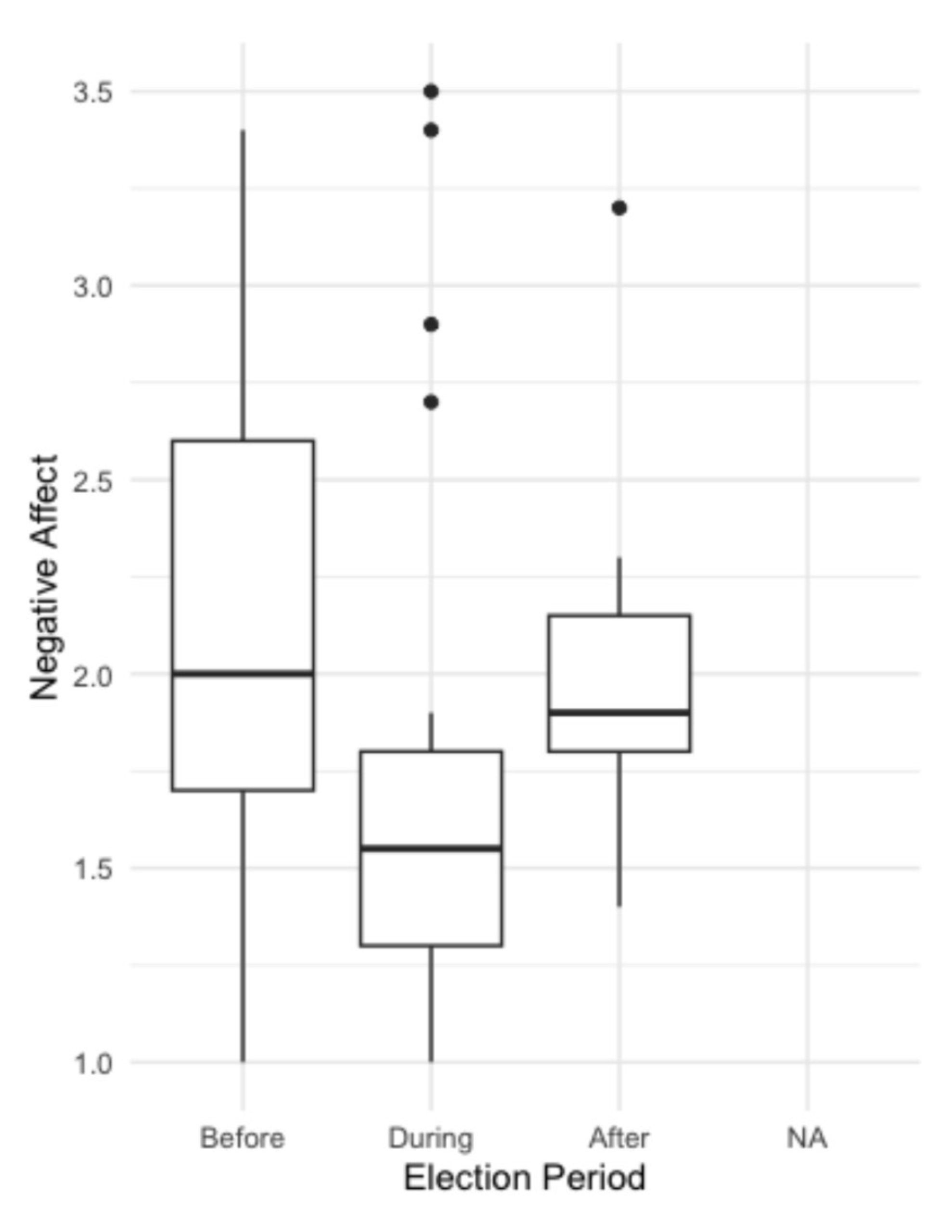 Changes in negative affect followed a complementary pattern, though the effects were less pronounced. The overall ANOVA showed a marginally significant effect of time (F(2, 58) = 2.35, p = .105). Tukey HSD comparisons revealed a trend toward decreased negative affect during the election compared to the pre-election period (Mean difference = -0.38, 95% CI [-0.81, 0.04], p = .086). This reduction in negative affect did not persist into the post-election period, as indicated by non-significant differences between post-election and both pre-election (Mean difference = -0.14, 95% CI [-0.69, 0.41], p = .811) and election day (Mean difference = 0.24, 95% CI [-0.33, 0.81], p = .573) measurements.