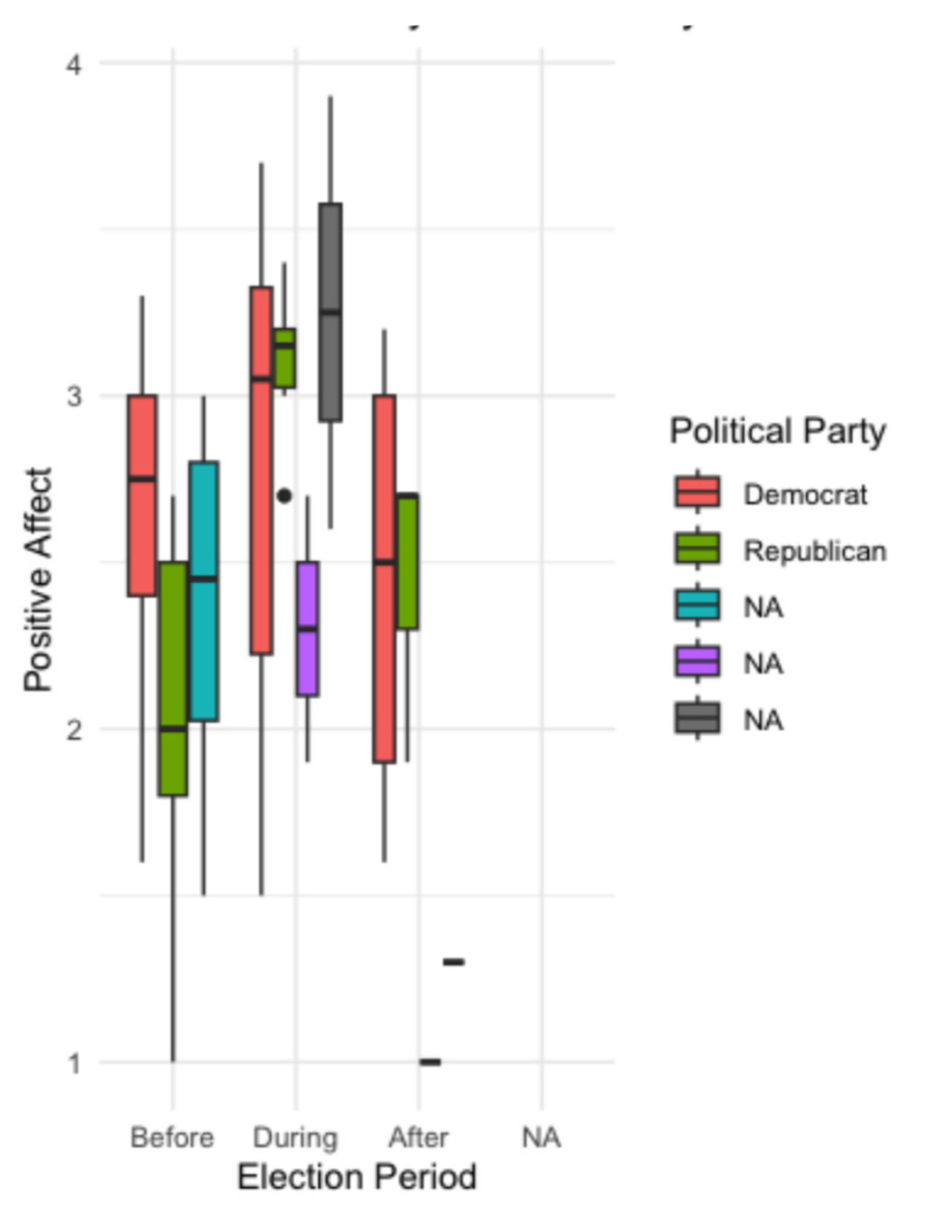 These findings suggest that while Democrats and Republicans experienced the election differently, these differences were primarily manifested in positive emotional responses rather than negative emotions or stress levels. Republicans showed a more pronounced increase in positive affect during the election period, while both parties showed similar patterns in negative affect and maintained stable stress levels throughout the election cycle. This pattern of results suggests that political party affiliation among Asian Americans primarily influenced the experience of positive emotions during the election, while negative emotional responses and stress management remained relatively consistent across party lines.
