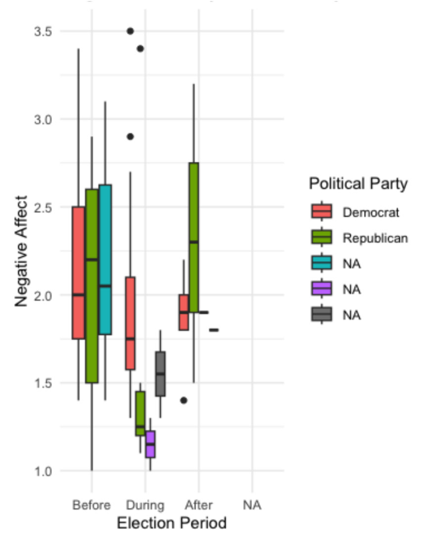 In contrast, the analysis of negative effects revealed no significant party-related patterns (F(5, 53) = 1.13, p = .355, R² = .097). Neither the interaction between party and the election period (b = -0.11, SE = 0.44, p = .803) nor between party and the post-election period (b = 0.60, SE = 0.54, p = .274) reached significance. The main effect of party affiliation was also non-significant (b = -0.12, SE = 0.31, p = .698), suggesting that changes in negative affect over the election period were relatively consistent across party lines (see Figure 5).