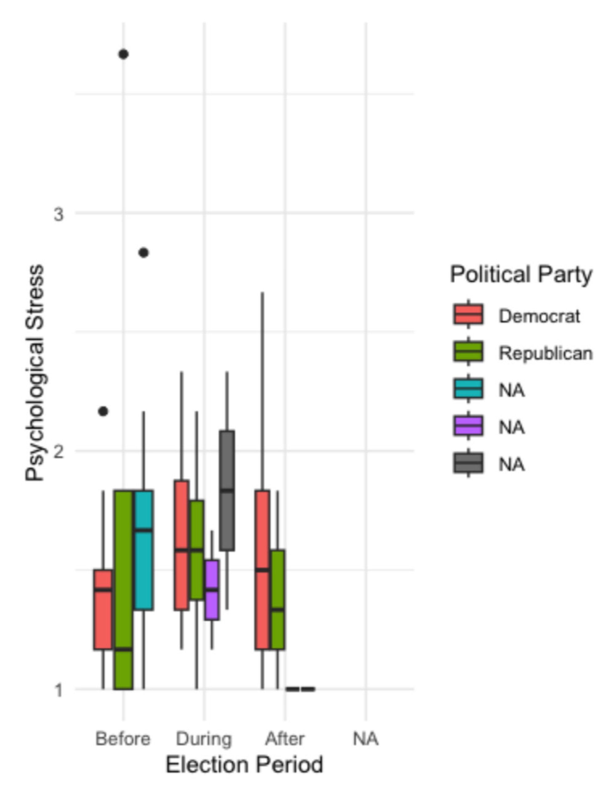 Psychological stress showed remarkable stability across both party affiliations and time periods (see Figure 6). The model revealed no significant effects (F(5, 53) = 0.25, p = .937, R² = .023), with all interaction terms and main effects failing to reach significance. Neither the interaction between party and the election period (b = -0.22, SE = 0.37, p = .557) nor between party and the post-election period (b = -0.28, SE = 0.45, p = .536) was significant. The main effect of party affiliation was also non-significant (b = 0.22, SE = 0.26, p = .409), indicating that stress levels remained stable regardless of political affiliation or timing relative to the election.