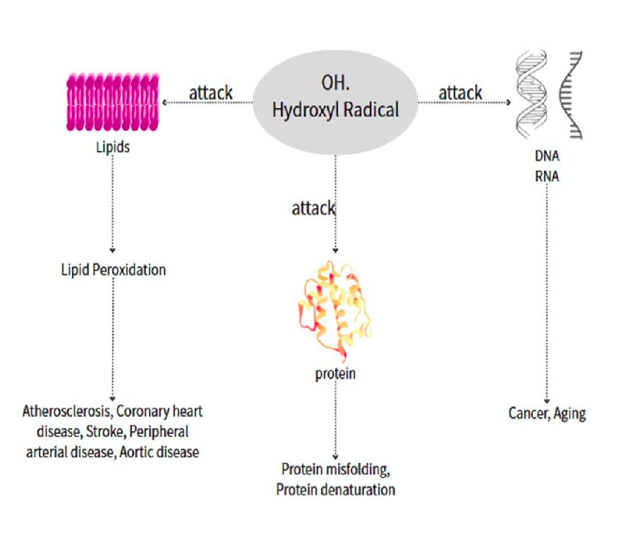 Most common chronic or age-related diseases are associated with low GSH levels and ROS attacks. ROS can cause cellular damage (Figure 2) and subsequent problems such as cardiovascular, inflammatory, immune, and metabolic disorders, as well as cancer37,38. Excessive ROS, such as hydroxyl radicals (