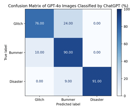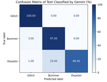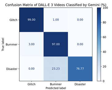 As the ChatGPT API currently lacks support for video input, video classification was conducted exclusively using the Gemini API. Accuracy was high for glitches and bummers (99%, 98%, 97%, 95%), but substantially lower for disaster scenarios (77%, 72%). Overall, video-based predictions exhibited slightly reduced accuracy compared with text classification, particularly for the disaster category.