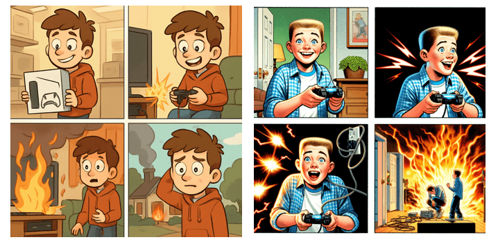 Selecting the appropriate image creation tool is a critical step in scenario video generation. DALL-E 3 exhibited limitations in realistically representing the severity of social scenarios, particularly in disaster contexts. Human evaluators identified 34 of the 200 disaster images as exaggerated to a degree that could induce anxiety in children. For example, several images depicted fires with excessive scale and dramatic effects rather than realistic portrayals. The most striking example occurred when the system generated an image of a zombie apocalypse, despite the accompanying text describing only a neighborhood-wide power outage. In contrast, GPT-4o images more often presented more realistic settings and characters with natural facial expressions, reducing the likelihood of causing anxiety compared with DALL-E 3. Coupled with stronger alignment to the story script and superior aesthetic quality, GPT-4o is generally preferred over DALL-E 3 for social scenario generation.