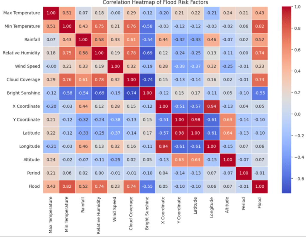 A correlation heatmap (Figure 1) was derived from the Pearson correlation coefficients to examine the correlations among various environmental factors and the flood occurrence. The majority of the variables are revealed to have weak to moderate associations with flood occurrence according to the heatmap. However, some specific factors stand out among them. Notably, Minimum Temperature is strongly correlated with flood occurrence (r = 0.82), followed by cloud coverage and relative humidity (r = 0.74), rainfall (r = 0.52), and maximum temperature (r = 0.43). Bright sunshine, however, negatively correlates with floods (r = -0.55). These results show that none of the variables are entirely predictive on their own, but combinations of those climatic factors can be strong predictors of floods. Feature importances were also computed from a Random Forest Classifier using the model’s impurity-based feature importance. A SHAP summary of the neural network model was also evaluated to validate the feature importance ranking.