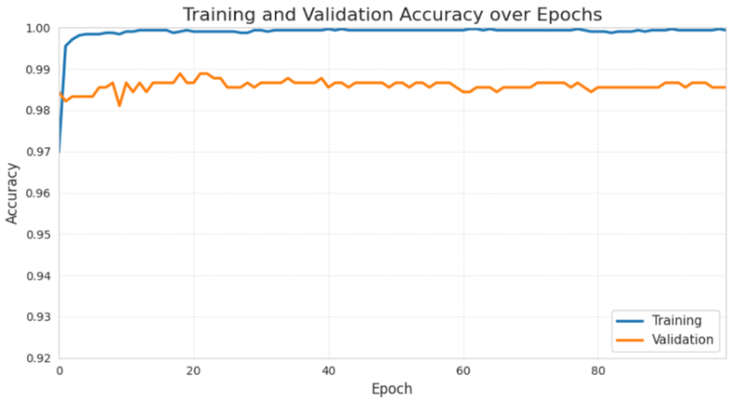 A training and validation accuracy graph over 100 epochs is presented in Figure 3. Both training accuracy and validation accuracy increased during the first few epochs before plateauing for the remainder of training. Specifically, training accuracy steeply increases in the first 10 epochs, from around 97% to 99.8%, and plateaues at around 99.7% to 99.9% for the next 90 epochs.
