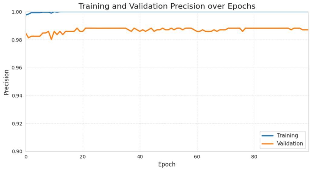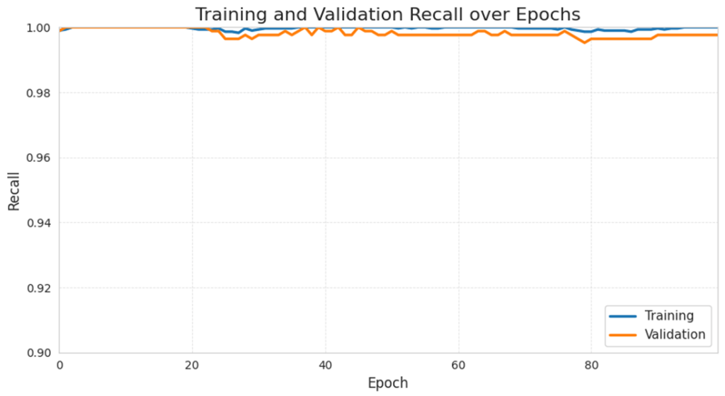 Similar to training precision, the training recall value also stays very high throughout training, always at around 99.8% to 100%. The model’s validation accuracy follows a similar trend, staying relatively high over the 100 epochs and fluctuates at around 99.52% to 99.9%. The high recall value shows that the model is strong in predicting positive events, suggesting a low the number of false negatives.