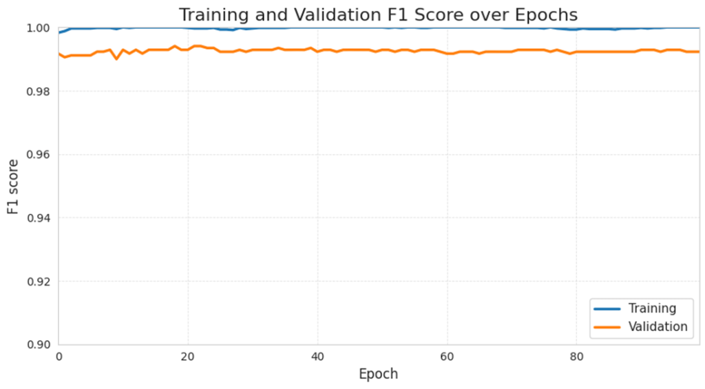 The F1 curves mirror the trends of recall and precision: training F1 and validation F1 stays relatively high throughout training, with little fluctuation. Specifically, the training F1 score stays at around 99.8% to 100% while the validation F1 score fluctuates between 99.1% to 99.3%. The training and validation F1 curves are close, showing a balanced precision and recall behaviour on the validation set.