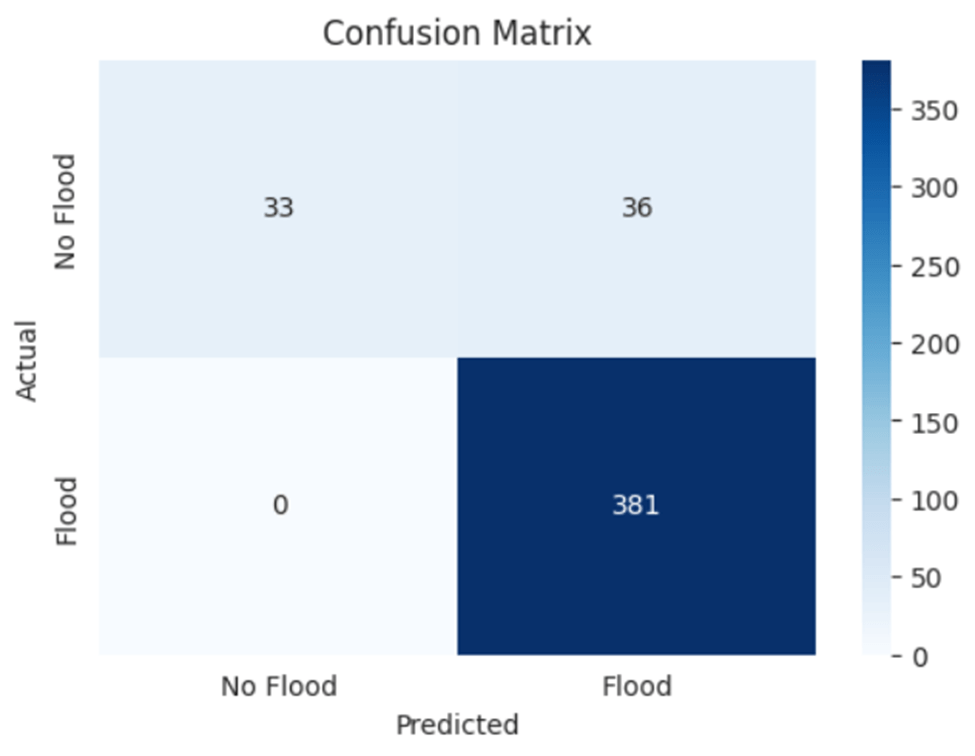 Secondly, Logistic Regression was tested and achieved 98.66% validation accuracy, demonstrating a strong performance with significantly faster training time and simpler architecture. Further evaluation of the performance of the Logistic Regression model is shown in the confusion matrix (Figure 8). It accurately predicted 33 cases of No Flood and 381 cases of Flood, with 36 false positives and 0 false negatives.
