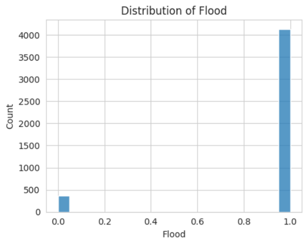 Of the original 20,544 rows in the dataset, 4,493 (21.87%) rows had flood labels while 16,051 (78.13%) were missing flood labels. Thereby, all unlabeled rows were excluded from training so that incorrect assumptions about flood occurrences were not made.