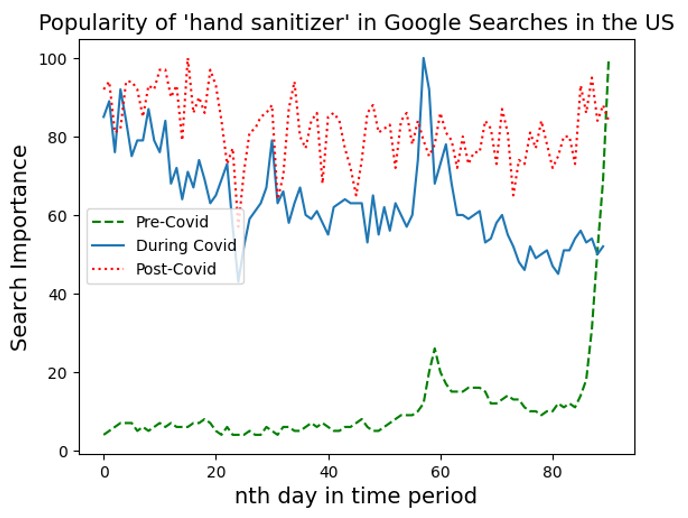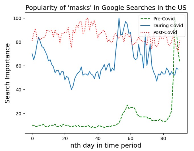 For the Google Trends data analysis, I used Pandas, a Python coding library. I wrote several lines of code and created graphs to show how often a specific term was being searched during different time periods. All three time periods are displayed on one graph, along with a key. These graphs make it easier to truly see the pattern of these searches and how popular they were at specific times.