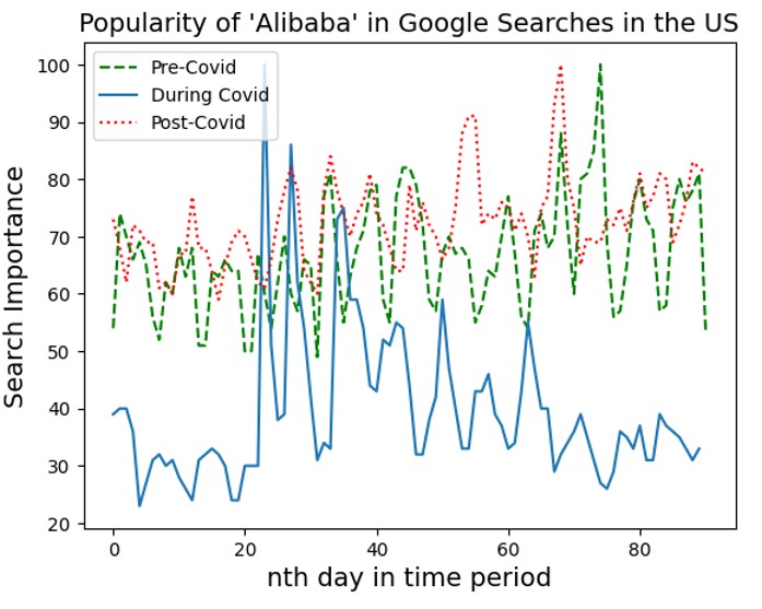 In Figure 10, we can see that the popularity for the search term “hand sanitizer” substantially increased during COVID, and increased even further post-COVID. This suggests a growing public interest in hand sanitizer since the pandemic, which may reflect increased purchasing and, indirectly, a rise in packaging-related plastic use. Finally, Figure 11 indicates a decrease in search importance for “Alibaba” during COVID, and then an increase post-COVID. Several of these graphs point to potential increases in packaging-related waste since the pandemic, though this study does not directly measure plastic consumption.