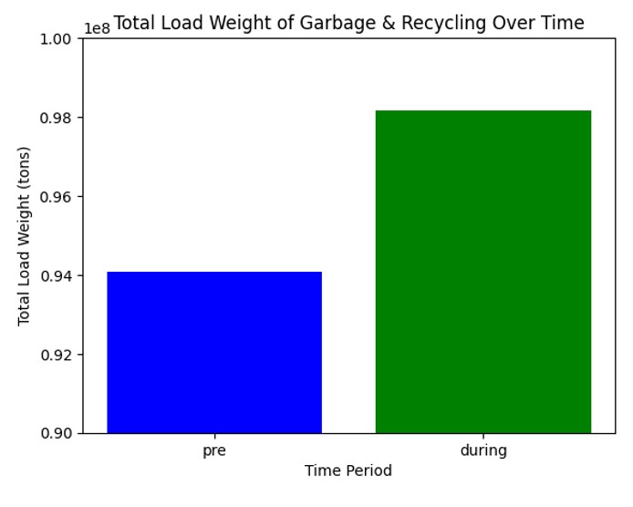 To assess whether changes in waste collection were statistically significant, I performed independent two-sample t-tests comparing pre-COVID and during-COVID periods. These tests were applied to NYC monthly garbage and recycling totals and to Austin’s daily combined garbage and recycling loads. The NYC data included three months per period; the Austin data included 70–77 daily entries per period. A significance level of p < 0.05 was used.