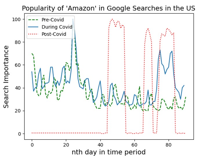 Figure 4 illustrates that the term “masks” was more frequently searched on Google during COVID, in comparison to pre-COVID. The popularity of this term remained high and even increased post-COVID. Figure 5 shows that search interest in the term “Amazon” increased during COVID, with there being times when the search importance of this term remained high after the pandemic. Another interesting observation to note regarding Figure 5 is that the 25th day in the time period, which is Christmas (December 25), is when the word “Amazon” has the highest search importance.
