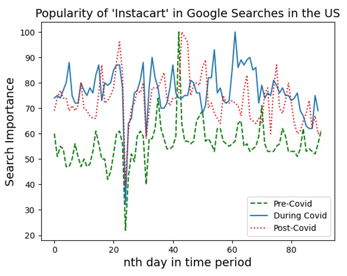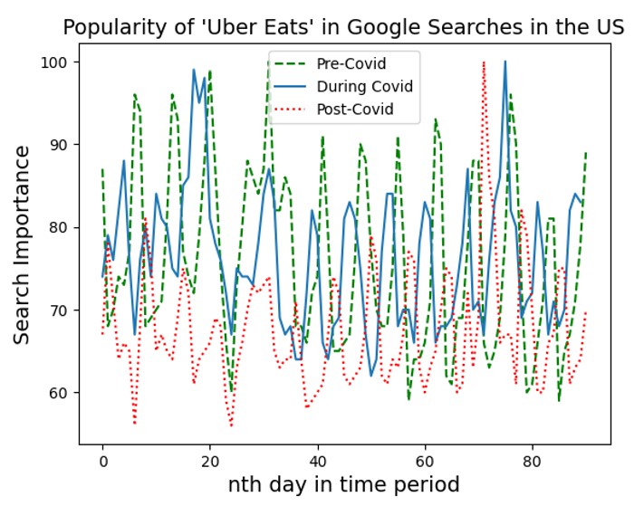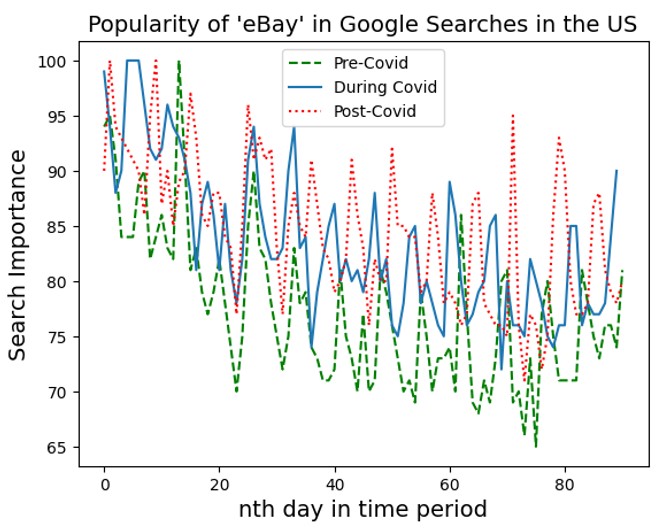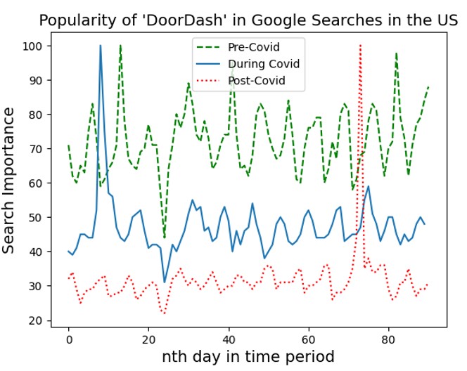 Figure 6 demonstrates that the search importance in Google for the word “eBay” increased during COVID, and slightly even more post-COVID. In Figure 7, we can see that the popularity of the search term “Instacart” increased significantly during COVID, and at times, increased post-COVID. This suggests that interest in online grocery delivery increased during the pandemic, which may reflect a shift in consumer behavior that potentially contributed to more packaging-related waste. Figure 8 reveals that the search importance of “DoorDash” actually decreased during COVID, and decreased further post-COVID. Figure 9 shows that the search importance of the term “Uber Eats” was relatively similar pre-COVID and during COVID, however, it decreased post-COVID.
