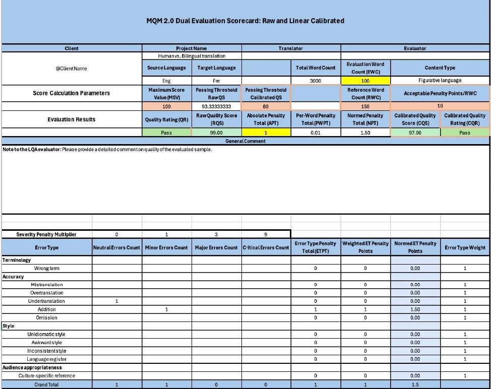 In addition to the previous annotation work, the raw error count was recorded using the official MQM Scorecard. Calibrated scores were computed by assigning weighted penalties based on severity: minor errors were weighted with a factor of 1, major errors with a factor of 3, and critical errors with a factor of 9. Neutral observations were noted for qualitative purposes but did not contribute to the score. This scoring system yielded a single aggregate quality score out of 100 for each translation output. To ensure consistent score normalization while accounting for sentence length, the Reference Word Count (RWC) was set to 3/2 the length of the Evaluation Word Count (EWC). For example, if a translated sentence contained 20 words, its RWC was set to 30.