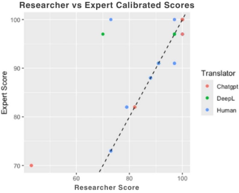 Interestingly, while GPT-4 consistently outperformed individual baselines, the combined “AI vs. human” comparison did not show a significant difference. This reflects the unevenness of AI systems. It is also worth noting that for this study, a non-personalized version of GPT-4 was used, with no user sign-in, as described under Methods; it is possible that the translation abilities of the AI differ depending on user-introduced biases; future work examining the degree to which the generic and user-tailored GPT-4 provide similar translation would provide important insight into the translation capabilities of artificial machines.