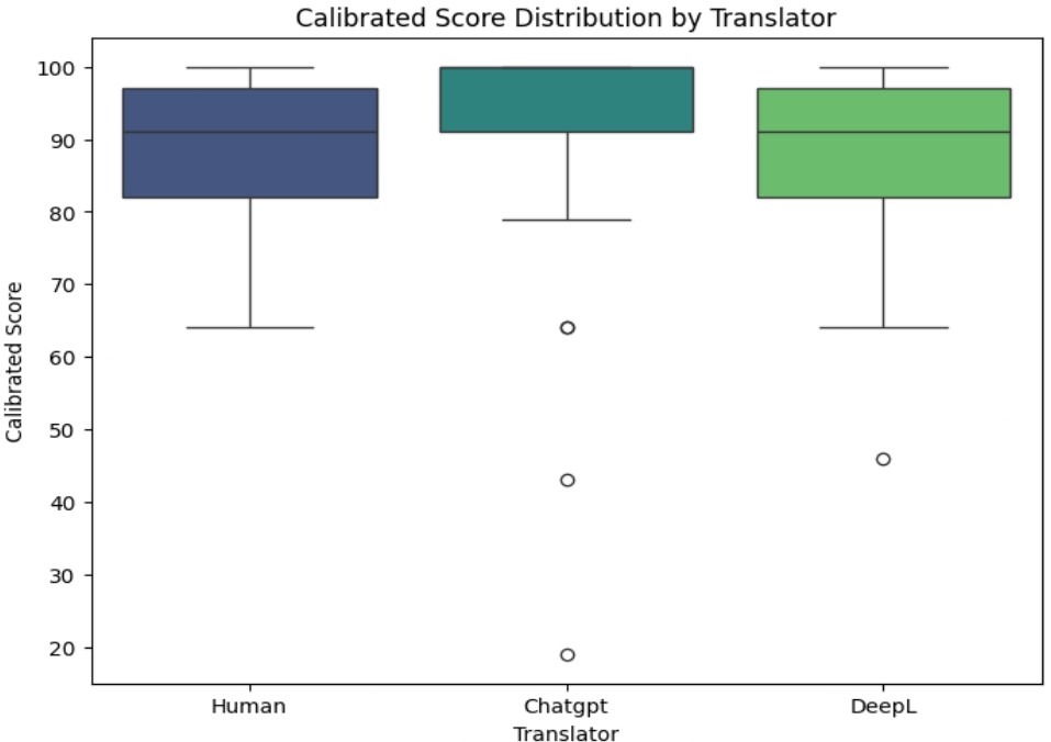 To determine whether AI systems as a group outperformed humans, GPT-4 and DeepL were combined into a single “AI” category and compared it with human translators using a Welch two-sample t-test. This broader analysis did not reveal a statistically significant difference between AI (M = 87.1) and Human (M = 85.7), with t-statistic of 0.88 and a p-value of 0.38, exceeding 0.05. Thus, while GPT-4 individually outperformed both Human and DeepL, the AI category as a whole was not consistently superior to human translators.