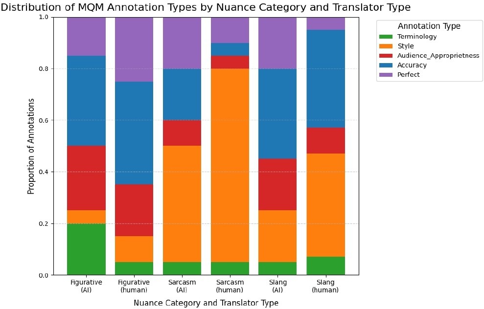 While prior researchhas studied specific nuance types such as metaphor, idiom, or sarcasm, few studies have adopted a multi-category approach comparing human and AI translation performance10,11,12,13. This gap left an incomplete picture of where AI translation excels, where it fails, and how its performance compares to human bilinguals across multiple kinds of linguistic nuance. This study sought to address this gap by conducting a controlled comparison of human and AI-generated translations across three distinct types of linguistic nuance: figurative language, slang, and sarcasm. With the MQM framework, this research evaluated not only accuracy but also error types made. The study further aimed to identify where MT falls short when translating nuanced language and to what extent human expertise remains essential in preserving meaning beyond the literal.