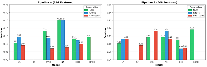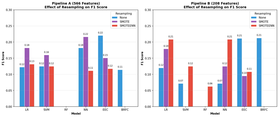 In Pipeline A (566 features), the high-dimensional feature space is sparse, allowing SMOTE-generated synthetic samples to spread without overlapping the majority class. In Pipeline B (208 features), the reduced feature space is denser and more compact, increasing the risk of synthetic samples overlapping with the majority class. SMOTEENN addresses this by applying an ENN cleaning step to remove noisy borderline samples. Traditional models (LR, SVM, NN) benefited from resampling, particularly on high-dimensional data. SMOTE improved F1-score for LR_566 (0.12→0.18), SVM_566 (0.13→0.16), and NN_566 (0.18→0.22). This improvement was driven primarily by recall gains—SVM_566 with SMOTEENN achieved 0.48 recall (vs 0.10 baseline)—though often at the cost of precision (0.18→0.07 for SVM_566_SMOTEENN). On reduced features (Pipeline B), SMOTEENN was more effective, with LR and NN both achieving F1=0.21.Ensemble models (EEC, BRFC) were hurt by resampling. These models already handle class imbalance internally through balanced bootstrapping, and adding synthetic samples disrupted their performance. EEC F1-score dropped from 0.22 to 0.15 with SMOTE, with recall falling from 0.62 to 0.19. BRFC failed completely (F1=0) with any resampling on both pipelines. Figures 5, 6, and 7 show the impact of resampling on F1-score, Precision, and Recall respectively. Full details are provided in Appendix Table B.