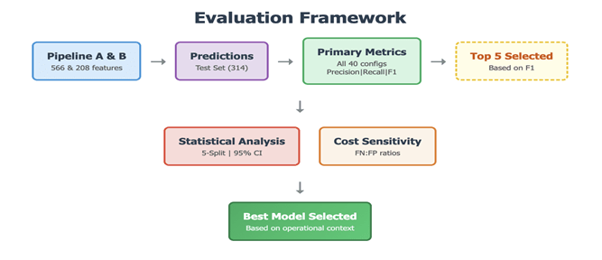 The evaluation framework depicted in Figure 4 addresses both methodological rigor and practical utility . Minority class metrics (precision, recall, F1) assess defect detection capability. Top 6 models were selected on the basis of F1-score, the same models were assessed for statistical reliability using 95% confidence intervals from 5-split cross-validation. Cost-sensitivity analysis for the same top 6 models was checked.Cost-sensitivity analysis enables practitioners to select models based on their operational cost structure.