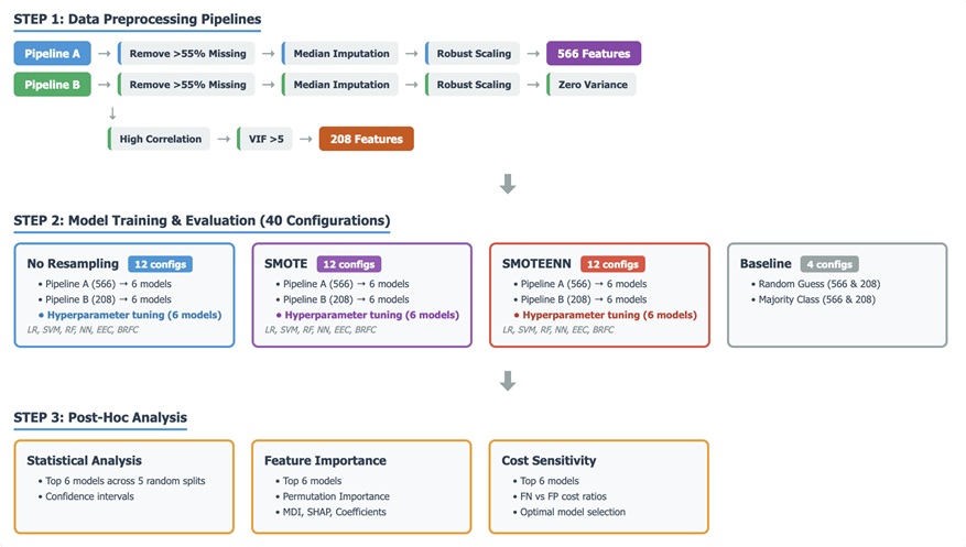 Figure 1 presents the complete experimental methodology. The critical design principle is that all preprocessing occurs after the initial train-test split, and all transformations (imputation, scaling) are fitted only on training data then applied to test data. This prevents any information from test samples leaking into the training process for all models. Following steps were followed (1) Columns with > 55% missing data were removed (2)Â train-test split (80/20) was split.(3) Median imputation fitted on training data only (4) Robust scaling fitted on training data only , less sensitive to outliers, with parameters fitted only on the training data. After this two preprocessing pipelines were developed. Pipeline A (566 features): This pipeline focuses on data cleaning and scaling without aggressive feature reduction beyond initial missing value handling. Pipeline A had 566 features, two resampling methods were applied which are explained in sec 3.4. Pipeline B (208 features):This pipeline builds upon Pipeline A by performing additional aggressive feature reduction steps.(5) Remove features with zero variance (6) Remove features with >0.95 Pearson correlation.(7) Features exhibiting high Variance Inflation Factor (VIF) scores (indicating multicollinearity above a threshold of (5) are iteratively removed until all remaining features have VIF below the threshold. Pipeline B had 208 features, two resampling methods were applied which are explained in sec 3.4.