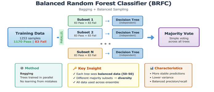 Balanced Random Forest Classifier (BRFC)-A variant of the Random Forest algorithm for imbalanced datasets. Each bootstrap sample for building individual trees is drawn in a way that balances the class distribution. It oversamples the minority class and undersamples the majority class to create balanced subsets for tree training, enhancing the model’s sensitivity to the minority class. Figure 3 shows the working of BRFC. Hyperparameter Tuning:Optimized parameters included `n_estimators` (the number of decision trees), `max_depth` (the maximum depth of each tree, controlling complexity), `min_samples_split` (the minimum number of samples required to split an internal node), and `max_features` (the number of features considered for the best split).