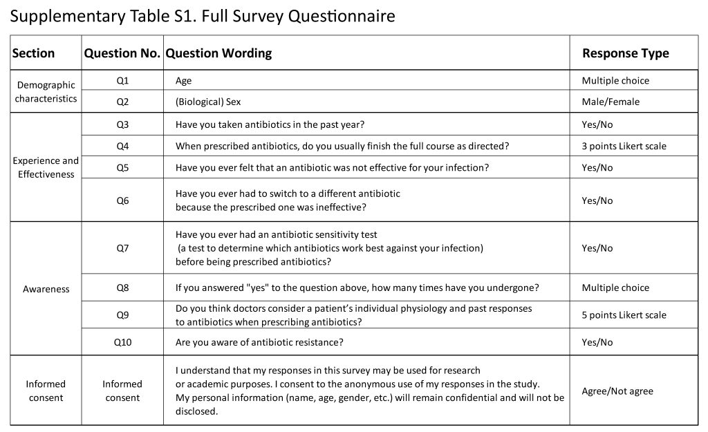 A cross-sectional survey was conducted to assess participants’ perceptions of antibiotic effectiveness and their awareness of antimicrobial susceptibility testing (AST). A total of 39 adult participants aged 21 to 60 years were recruited through workplace networks and extended family contacts using both in-person and online outreach. The survey was administered using a structured Google Forms questionnaire accessed via a QR code distributed either in person or through the KakaoTalk messaging platform. The 10-item questionnaire consisted of three sections: (1) demographic characteristics (age, gender); (2) experiences with antibiotic prescriptions and perceived effectiveness; and (3) awareness and prior experience with AST. All questions were closed-ended, utilized binary (yes/no) or 5-point Likert-scale response formats. Participation was voluntary, and informed consent was obtained from all participants. All survey responses were anonymized prior to analysis. The full questionnaire is provided in Supplementary Table S1.