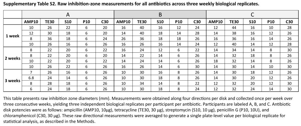The disk diffusion assays revealed reproducible participant-specific inhibition zone patterns, particularly for ampicillin and penicillin G, across three independent weekly biological replicates, while streptomycin and chloramphenicol exhibited relatively uniform inhibition zones across participants. This observed variability aligns with previous studies demonstrating that microbial community composition influence antimicrobial efficacy20, that metabolic interactions can modulate antibiotic tolerance within mixed-species communities21, and that resistant subpopulations can provide protective buffering to susceptible taxa during antibiotic exposure22. Collectively, these established mechanisms offer a plausible biological explanation for the interindividual variability in community-level antimicrobial responses observed in this pilot study.