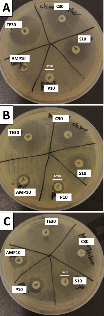 Disk diffusion assays revealed reproducible interindividual differences in inhibition zone diameters for ampicillin, penicillin G, and tetracycline (Table 2, Figure 3 and 4). Sample A showed consistently smaller inhibition zones for ampicillin (8.7 0.9 mm) relative to sample B (14.3 2.3 mm) and C (13.8 0.6 mm). Similar patterns were observed for penicillin G (A: 6.0 0.0 mm; B: 9.5 2.6 mm; C: 11.0 1.3 mm) and tetracycline (A: 26.0 1.9 mm; B: 30.2 3.3 mm; C: 34.2 2.7 mm). In contrast, streptomycin and chloramphenicol exhibited relatively uniform inhibition zone across all three samples.