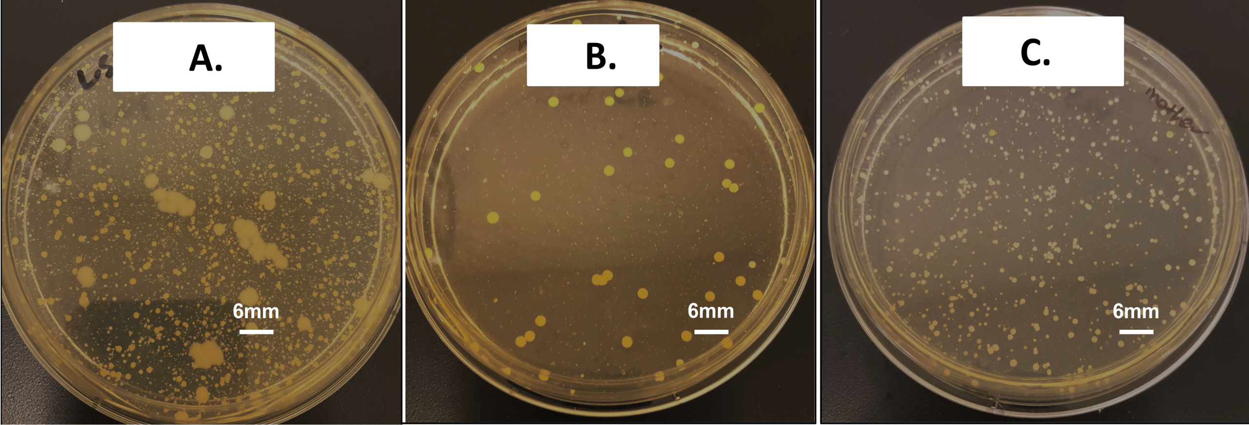 Oral microbiota cultured on Mueller-Hinton agar revealed visually distinct growth patterns across samples A, B, and C despite shared genetic and household environments (Figure 1). Sample A showed dense bacterial growth with highly heterogeneous colony morphologies, including several large mucoid-like colonies. Sample B showed fewer colonies with relatively uniform morphologies, whereas sample C displayed numerous small and evenly distributed colonies. Collectively, these distinct macroscopic characteristics indicate substantial person-specific heterogeneity in oral microbiota composition, even among individuals sharing genetics and the same household environment.
