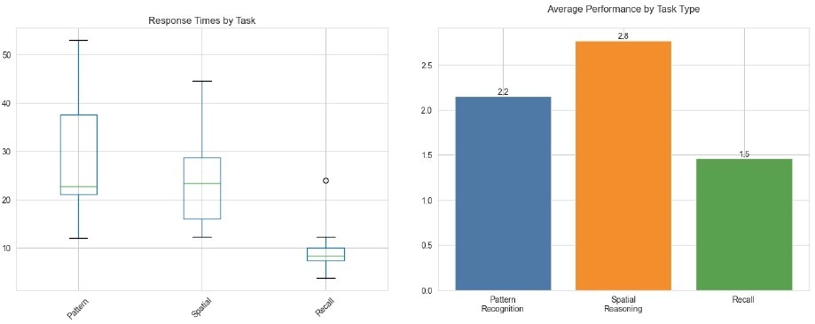 Descriptive statistics for IAS, ADHD inattentive symptoms, and cognitive task outcomes are reported in Table 1. Mean performance was highest for spatial reasoning (M = 2.77, SD = 0.83), followed by pattern recognition (M = 2.15, SD = 0.80) and recall (M = 1.46, SD = 0.78). The cognitive test total score ranged from 3 to 9 (M = 6.38, SD = 1.66). Mean response time across tasks was 21.79 seconds (SD = 8.21). By domain, pattern recognition showed the longest average response time (M = 28.57 s, SD = 13.53), and recall showed the shortest (M = 9.23 s, SD = 5.18). Figure 2 summarizes performance and response time profiles across task domains.
