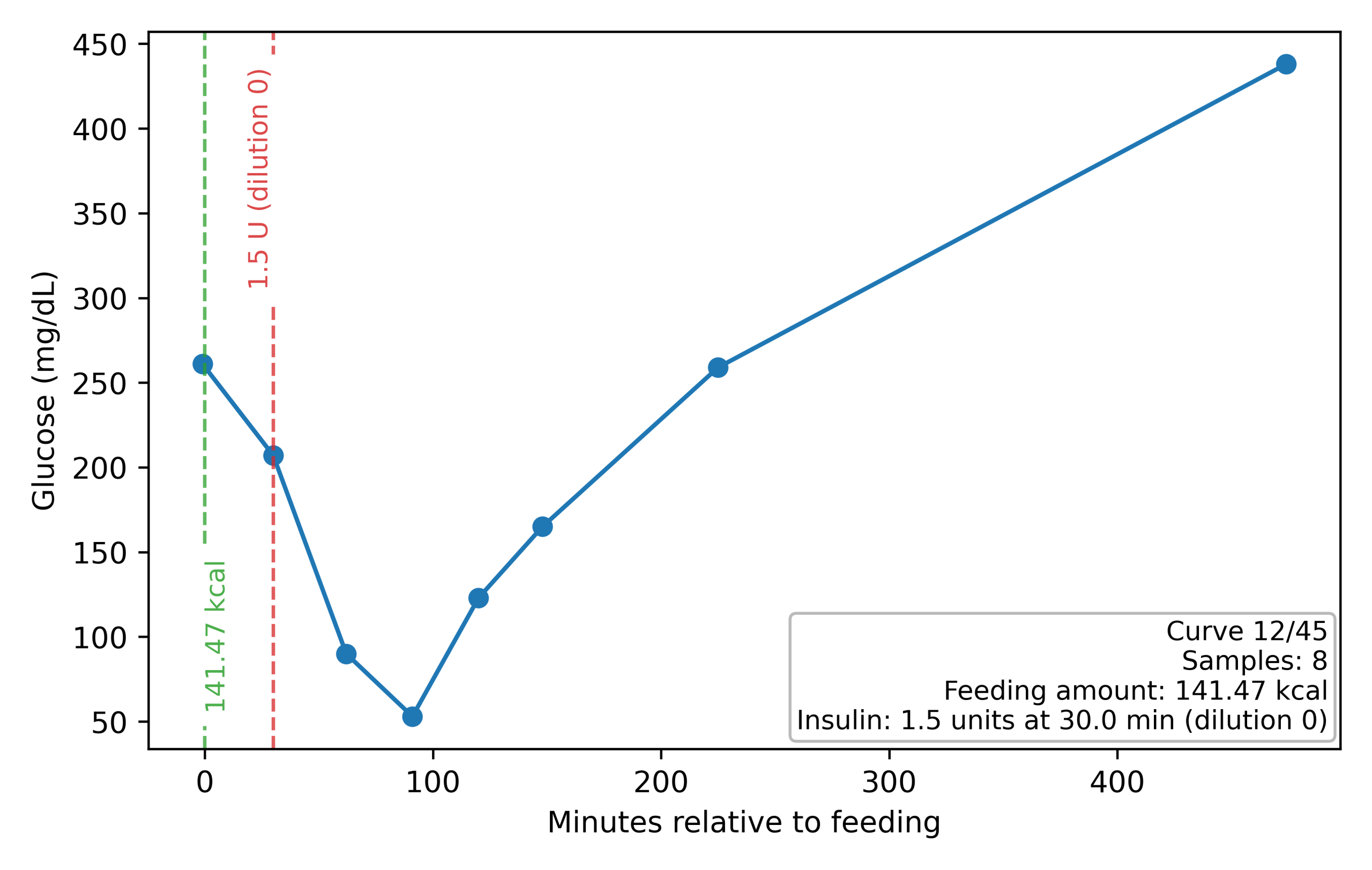 The model provides a solid basis for understanding the dynamics between the timing and quantity of feeding and insulin injection, and the resulting glucose curve. Specifically, feeding starts to impact glucose only after a delay, followed by a quick, strong peak and a gradual decay. NPH insulin starts to act rapidly after injection, counteracting the effects of the meal, with the most significant effect (nadir) a few hours after injection. Eventually, the effects of both the meal and the NPH insulin injection subside within 12 hours, on time for the next meal and injection. This simplified model does have limitations: a few glucose curves exhibited the Somogyi effect25, in which the organism responds to a hypoglycemic event by increasing glucose levels via internal mechanisms unrelated to feeding, resulting in excessive glucose. Explaining Somogyi requires more complex models than the one presented above.