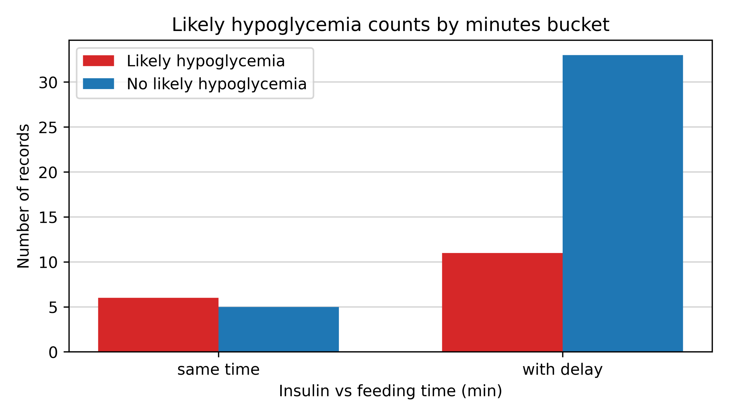 The data included 66 insulin injection instances with sufficient metadata and blood glucose readings, labeled as likely hypoglycemic or not-likely hypoglycemic, as described in the Data Analysis section. The data was separated into three groups: same time, with delay, and with delay (low insulin), depending on whether the insulin was injected at the same time as the food, or with a 1-hour delay. The low insulin group is shown for reference, but it is not comparable because the food type and insulin dose were very different. There were 11 same time instances, 44 with delay, and 11 with delay (low insulin). The three groups had 6 (55%), 11 (25%), and 5 (45%) likely hypoglycemic readings, respectively.
