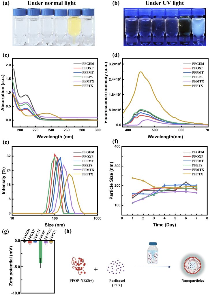 Drug solutions were prepared by dissolving 1 mg of Gemcitabine, Oxaliplatin, Pemetrexed, Etoposide, or Methotrexate in 1 mL of DMSO. For nanoparticle formation, 1 mL of PFOP-NEt3(+) (1.5 mM, 100 μL) was mixed with the drug solution (1 mg/mL), diluted to 1.1 mL, and stirred in the dark at room temperature for 12 h. For paclitaxel-loaded NPs, 1 mL of PFOP-NEt3(+) (1.5 mM, 100 μL) was mixed with 300 μL of paclitaxel injection (6.0 mg/mL), diluted to 1.1 mL, and stirred under the same conditions.