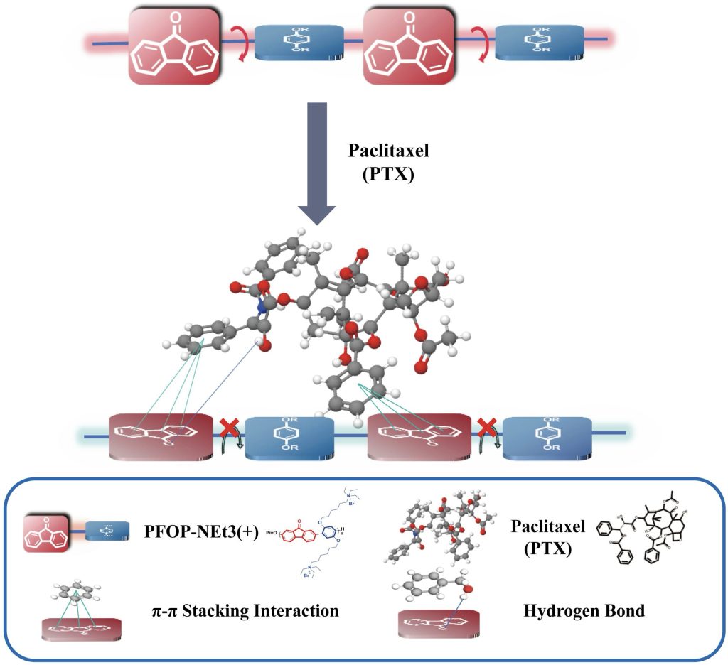 Strong π–π and hydrogen-bonding interactions between PFOP-NEt₃(+) and paclitaxel restrict the torsional motion of the fluorenone units, enforcing a more planar polymer backbone (Figure 2). At the molecular level, the positively charged NEt₃⁺ side chains engage in electrostatic interactions with the electronegative hydroxyl and carbonyl groups of paclitaxel, while the aromatic π-system of the fluorenone units participates in π–π stacking with paclitaxel’s benzene rings. In addition, carbonyl (C=O) and hydroxyl (–OH) groups along the polymer backbone act as hydrogen-bond acceptors and donors, forming multiple hydrogen bonds with paclitaxel’s abundant hydrogen-bonding sites. These cooperative electrostatic, π–π, and hydrogen-bonding interactions stabilize the polymer to drug assemblies and enable dense drug packing. Accordingly, drug-loading content determined by HPLC analysis revealed that PFPTX achieved a drug-loading capacity of 45% and an encapsulation efficiency of 80–86%.