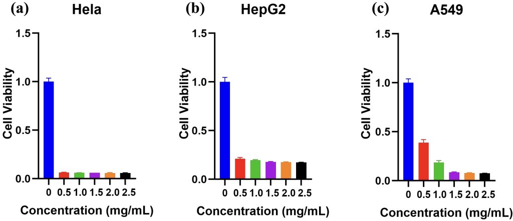 The cytotoxic effects of PFPTX were evaluated in HeLa, HepG2, and A549 cancer cell lines exposed to increasing concentrations of PFPTX (0-2.5 mg/mL) for 48 h at 37 °C in 5% CO2 (n=3). Cell viability assays showed pronounced dose-dependent cytotoxicity across all three cell lines (Figure 4a–c). HeLa cells were particularly sensitive, with 0.5 mg mL⁻¹ PFPTX reducing cell viability to approximately 6%, which shows 94% cytotoxicity (Figure 4a). In HepG2 cells, the same concentration caused 79% cytotoxicity, showing moderate sensitivity, and at 1.5 mg/mL, survival dropped to 18%. At low concentrations, A549 cells showed modest resistance, retaining 37 % and 19 % viability at 0.5 and 1.0 mg mL⁻¹, respectively; however, cytotoxicity surged to 92 % once the concentration reached 1.5 mg mL⁻¹. Statistics show that HepG2 cells showed moderate sensitivity (Figure 4b), while A549 cells exhibited partial resistance at lower concentrations but substantial cytotoxicity at higher doses.
