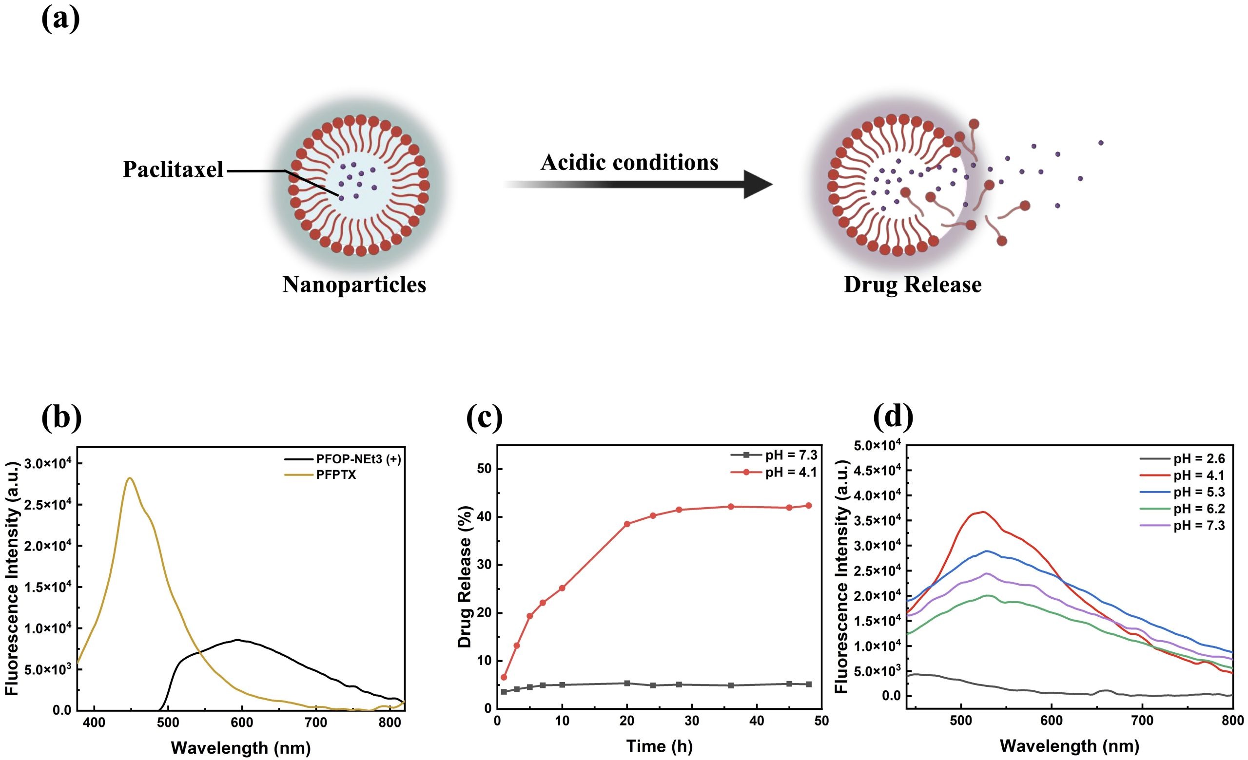 Since PFOP-NEt₃(+) and paclitaxel assemble into nanoparticles through noncovalent interactions, the marked fluorescence transition of blue shift suggested that luminescence might serve as an intrinsic indicator of drug loading and release. To explore this possibility, the pH-responsive release behavior of PFPTX was examined (Figure 3a). In aqueous solution, free PFOP-NEt₃(+) exhibited weak red emission with an emission maximum at approximately 600 nm (Figure 3b). This behavior can be attributed to the twisted conformation of the fluorenone units in the dispersed state, where unrestricted torsional motion reduces the effective π-conjugation length, thereby favoring lower-energy emission. Upon aggregation induced by drug binding, strong π–π and hydrogen-bonding interactions restrict intramolecular torsion, leading to conformational rigidification of the polymer backbone. This restriction enables more efficient π-electron delocalization and enhances radiative decay, resulting in a pronounced blue shift of approximately 146 nm to 454 nm and a substantial increase in fluorescence intensity (Figure 3b). This pronounced red-to-blue transition reflects a fundamental change in the polymer’s electronic structure driven by aggregation-induced backbone planarization and enhanced π-electron delocalization upon drug binding. Drug release experiments demonstrated that PFPTX was highly stable at physiological pH (7.3), with cumulative paclitaxel release remaining below 5% after 24 h (Figure 3c, black curve). In contrast, under acidic conditions (pH 4.1), paclitaxel release increased in a time-dependent manner, exceeding 40% after 24 h (Figure 3c, red curve), consistent with reported values for nanoparticle-based drug delivery systems in the literature17,18,19.