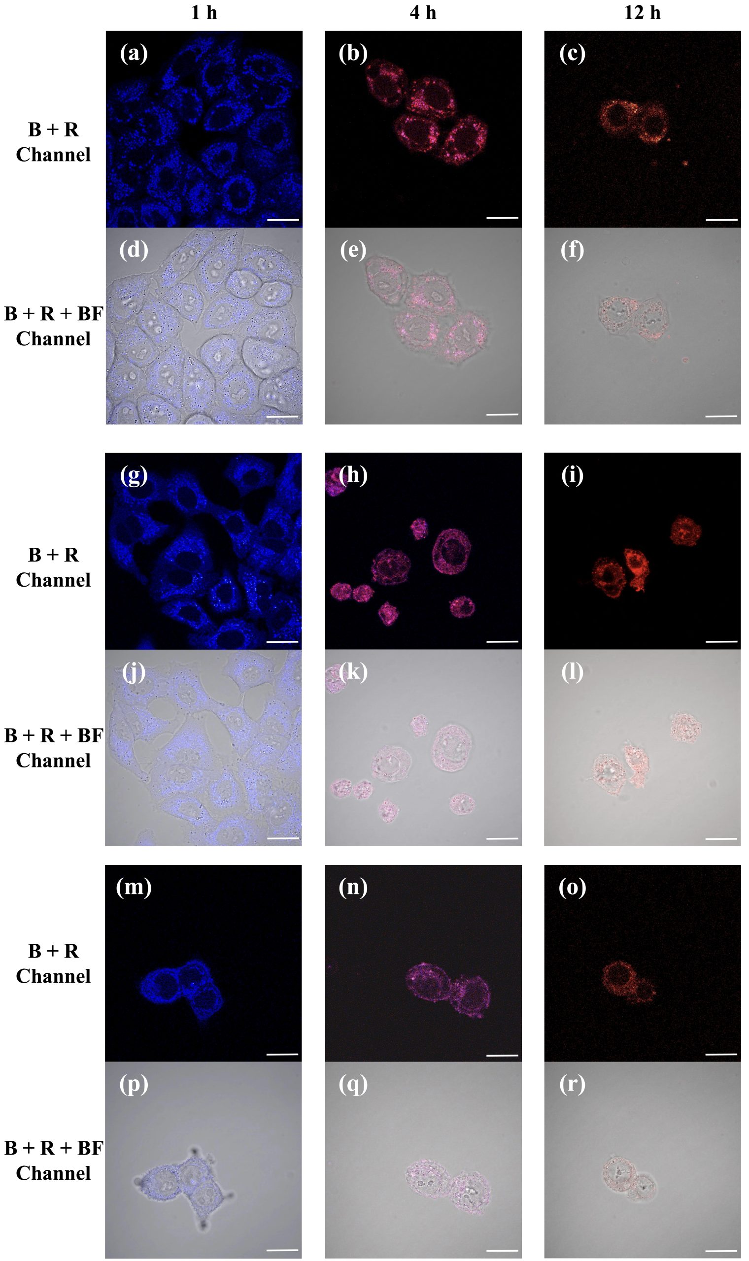 To visualize NP uptake and intracellular localization, fluorescence imaging was performed on HeLa, A549, and HepG2 cells treated with PFPTX (2 mg/mL) for different incubation times (1, 4, and 12 h) (n=3). Dual-channel imaging revealed progressive intracellular accumulation of nanoparticles, with distinct fluorescence signals corresponding to intact PFPTX and released polymer components (Figure 5a–c). Confocal microscopy further showed colocalization of fluorescence signals with lysosomes at all time points (Figure 5), consistent with endocytic uptake and lysosomal trafficking. At early incubation times, fluorescence images were dominated by blue emission, indicating intact nanoparticles (Figure 5a, g, m). At intermediate time points, overlapping blue and red signals produced purple emission, suggesting partial drug release (Figure 5b, e, h). At prolonged incubation times, fluorescence was predominantly red, consistent with extensive paclitaxel release and nanoparticle degradation (Figure 5c, i, o). Together, these results demonstrate that PFPTX functions as both an efficient drug delivery system and a built-in fluorescent reporter capable of tracking intracellular drug release in real time.
