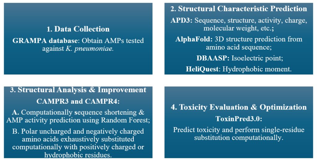 In this study, AMPs active against K. pneumoniae were retrieved from the Giant Repository of AMP Activities (GRAMPA) database and analyzed using various AI tools to evaluate their sequence, structure, activity, and toxicity, guiding the computational design of a new peptide with improved efficacy (Figure 1). GRAMPA is a database of antimicrobial peptides that provides their amino acid sequences and corresponding minimum inhibitory concentrations (MICs) against various bacterial strains, including target species and strain-level details. From GRAMPA database, peptides tested against the bacterium K. pneumoniae were examined to identify patterns in activity and to guide the computational design of new and improved AMPs. The Antimicrobial Peptide Database (APD3), a searchable database of innate immune peptides, was used to gather detailed information—including sequence, structure, activity, source, and physicochemical properties like total net charge and molecular weight computationally. AlphaFold, an AI system developed by DeepMind, was used to predict the three-dimensional (3D) structure of proteins based on input amino acid sequences. The Database of Antimicrobial Activity and Structure of Peptides (DBAASP), a manually curated resource developed to support the computational design of antimicrobial compounds with a high therapeutic index, was used to obtain the isoelectric point of peptides. HeliQuest, a bioinformatics tool for analyzing the amphipathic and structural properties of α-helical peptides, was used to calculate the predicted hydrophobic moment and generate helix wheels24. Collection of Anti-Microbial Peptides Release 3 (CAMPR3), a database of sequences, structures, and signatures of antimicrobial peptides, was used to computationally shorten the peptide sequence length applying the Random Forest algorithm; and CAMPR4, a subsequent release which expands and accelerates AMP based studies by providing curated information on natural and synthetic AMPs, was used to predict the novel peptide’s activity also applying the Random Forest algorithm. ToxinPred3.0, a web server that predicts peptide toxicity based on primary sequence using machine learning models, was used to obtain predicted toxicity scores and improve selectivity by replacing one amino acid through targeted substitution computationally. In ToxinPred3.0, toxicity scores range from 0 to 1, with higher values indicating greater toxicity; this study used a 0.38 cutoff, and scores are probabilistic and require experimental validation. AlphaFold is a web service powered by AlphaFold 3 that generates highly accurate 3D structure predictions for proteins, DNA, RNA, ligands, ions, and chemical modifications in a single platform (https://alphafoldserver.com/).