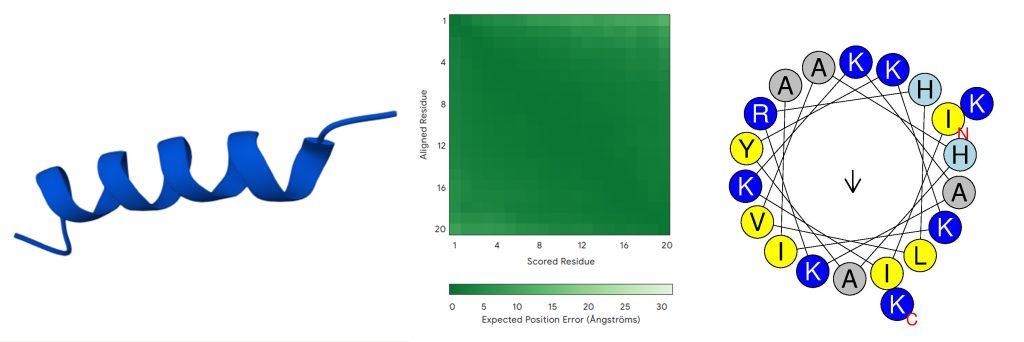 ) and one of the lowest predicted AMP probability scores (0.531), and was selected for mutational optimization. Table 1 summarizes its key characteristics, including a low predicted antimicrobial probability, high predicted MIC, low predicted net positive charge (+1), and high predicted toxicity (0.5). Figure 2 shows the predicted 3D structure and helix wheel of the initial peptide, as generated by AlphaFold and HeliQuest, respectively (default settings applied).