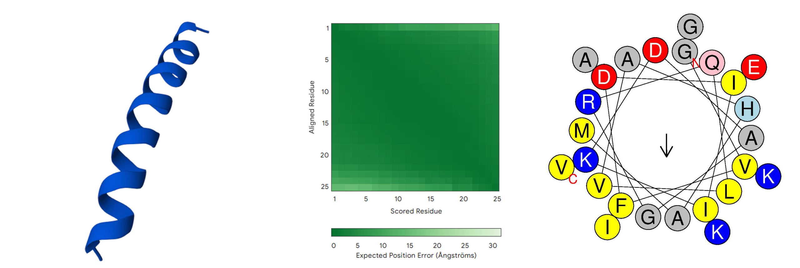 -helical fold with high pLDDT (mostly dark blue) and predominantly dark green PAE, reflecting very high local confidence and modest terminal flexibility. Comparison with the AlphaFold3-predicted LL-37 structure (Figure 4) reveals high pLDDT across the