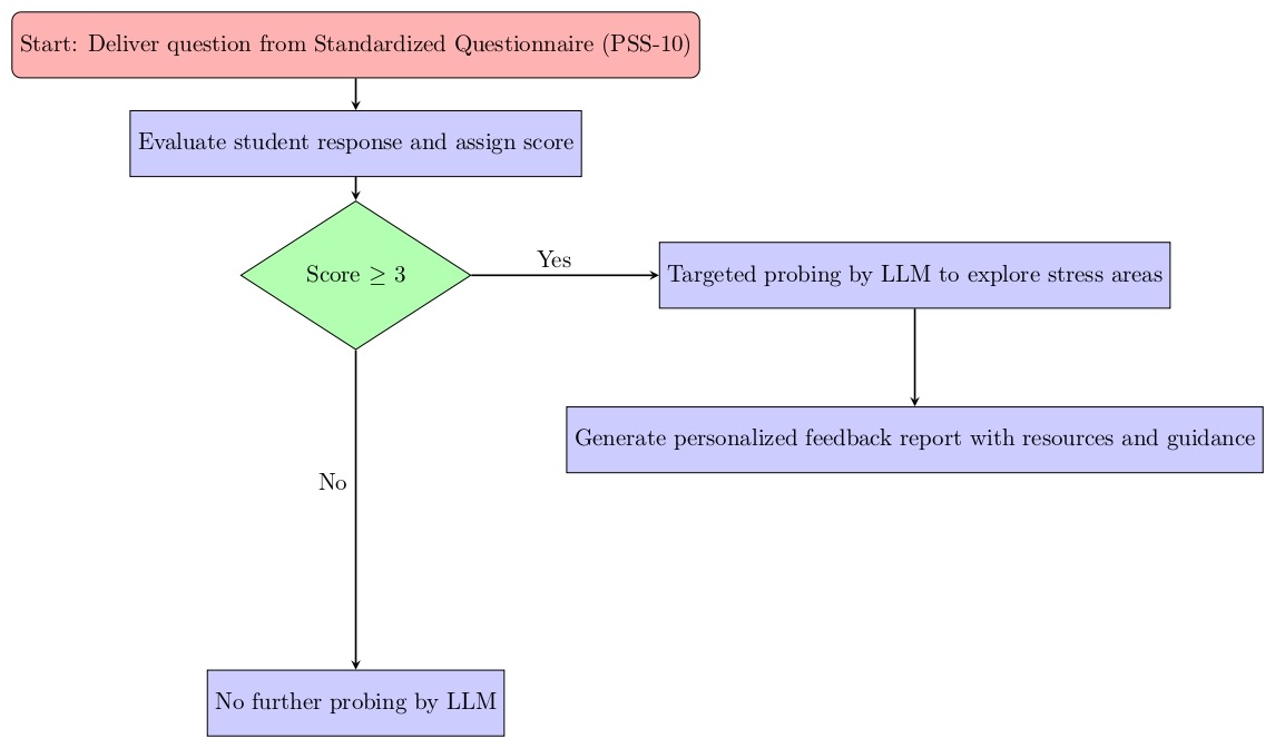 1. Threshold-based triggering: Follow-up questions are generated only for assessment items exceeding predefined thresholds (PSS-10 items scoring ≥3), ensuring probing targets genuinely elevated concerns rather than routine responses.