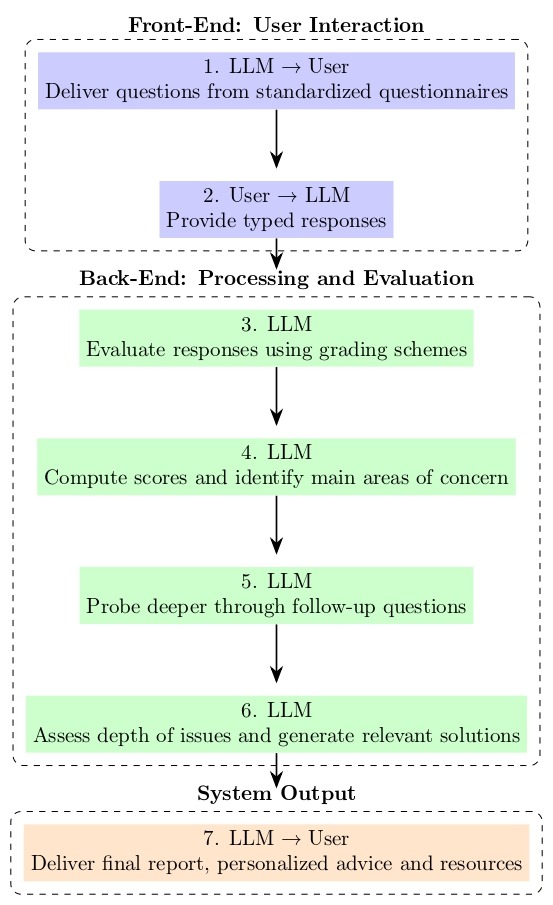 Critical limitations and scope boundaries: This system is explicitly designed as an early screening and mild-symptom support tool, NOT as a substitute for professional mental health treatment. It serves to: