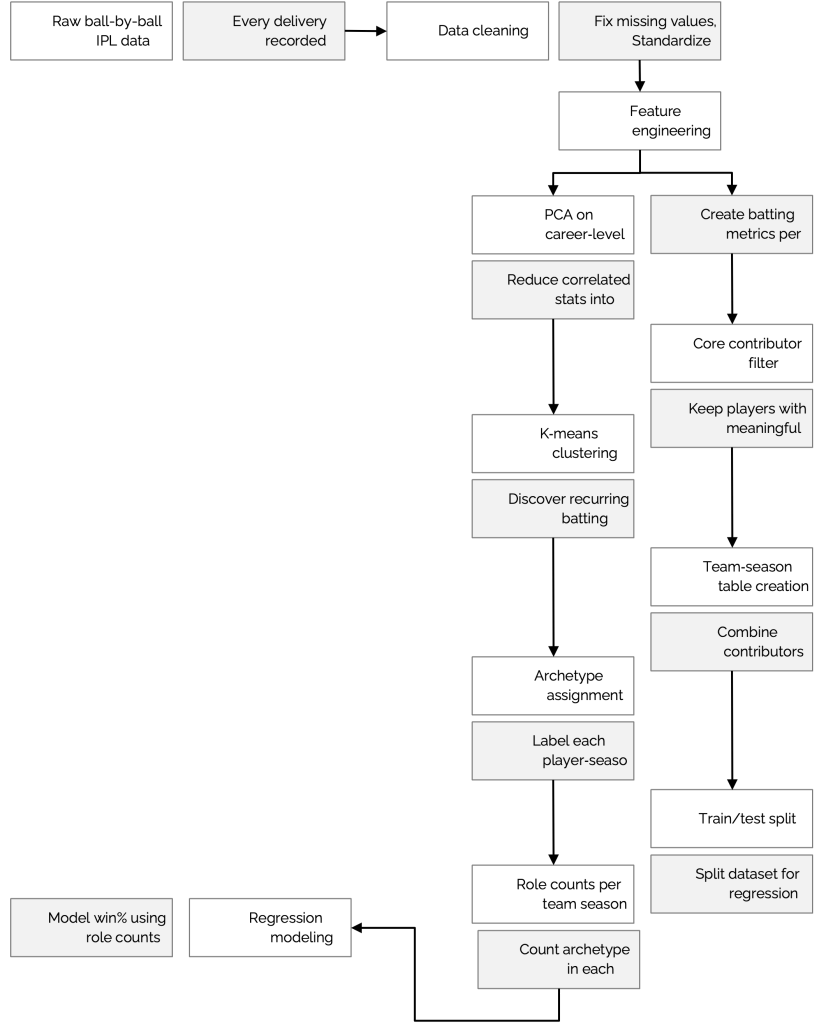 The second research question on the association between archetype composition and team success is addressed in the Regression Modeling section. Each team’s seasonal archetype composition is quantified by projecting qualifying player-seasons into the PCA–cluster space and aggregating role counts, which are then regressed against win percentage using Ordinary Least Squares (OLS). Together, these steps form an interpretable pipeline from granular ball-by-ball data to empirically defined batting roles and their relationship with long-term IPL team success This places our work between descriptive dashboards and black-box predictors: we use granular ball-by-ball data to empirically define roles and examine how their combination influences long-term IPL team success.